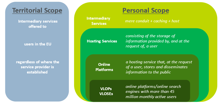 The personal scope of the DSA covers all intermediary services, including mere conduit, caching and hosting, as well as online platforms, including B2C marketplaces, and search engines. Finally, very large online platforms and very large online search engines, also known as VLOPs and VLOSEs, fall within the scope of the DSA.