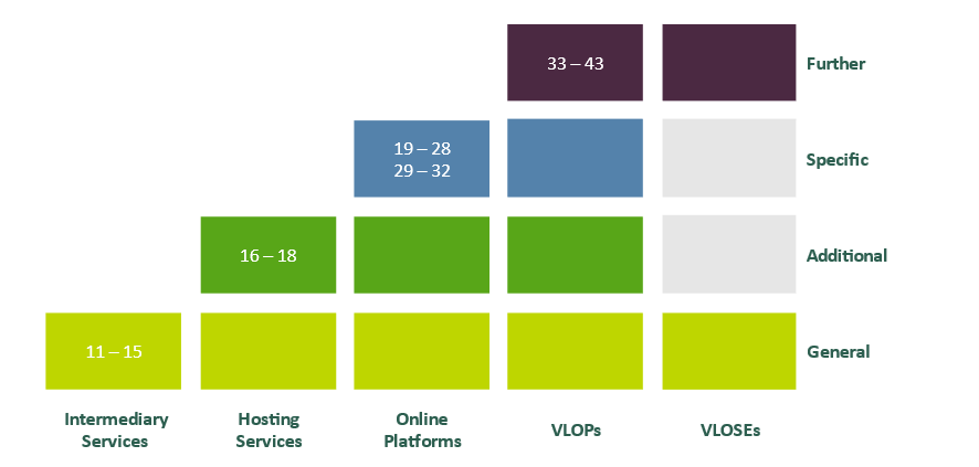 To achieve the intended uniform legal landscape in the digital services market, the DSA introduces a comprehensive catalogue of due diligence obligations (Artt. 11 – 43 DSA), ensuring increased transparency and accountability of providers. The system of obligations follows a tiered approach, which – simply put – means that the larger or more impactful the service, the more obligations the provider has to comply with. Failure to comply can result in considerable fines, up to 6% of the service provider's global annual turnover in the year preceding the violation.