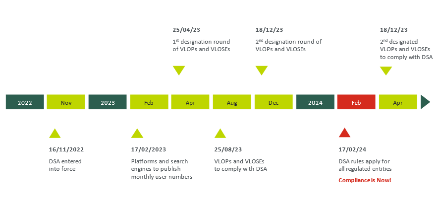 There are only a few days left before the DSA applies to all intermediary services covered by the DSA. This means: Compliance is now! We have come a long way. Your DSA compliance should be at the finish line or in full progress and if not, we would be most happy to help you. 17 February 2024 is the start of applicability but not the end of compliance efforts. As the DSA keeps all intermediaries busy, we will be monitoring upcoming changes, designations, and new developments to keep you informed for your DSA compliance.