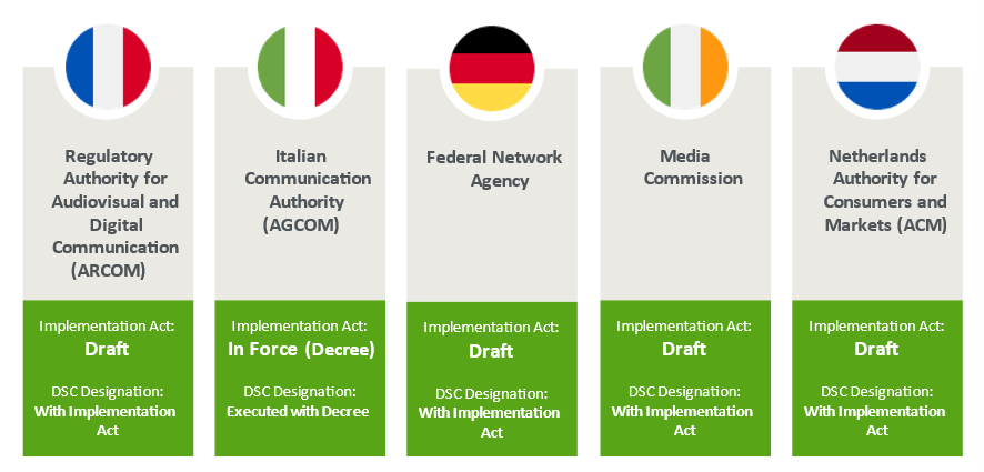 Italy designated the Authority for Communications Guarantees (AGCOM) as its DSC. In the other four Member States, the implementation acts appointing the national DSC and amending national law to align with the DSA are still being drafted or are under discussion in the respective parliament. In France, the Regulatory Authority for Audiovisual and Digital Communications (ARCOM) will be the DSC. In Germany, the Federal Network Agency will take over the competencies and tasks of the DSC. Ireland will appoint the Media Commission and the Netherlands the Netherlands Authority for Consumers and Markets (ACM).