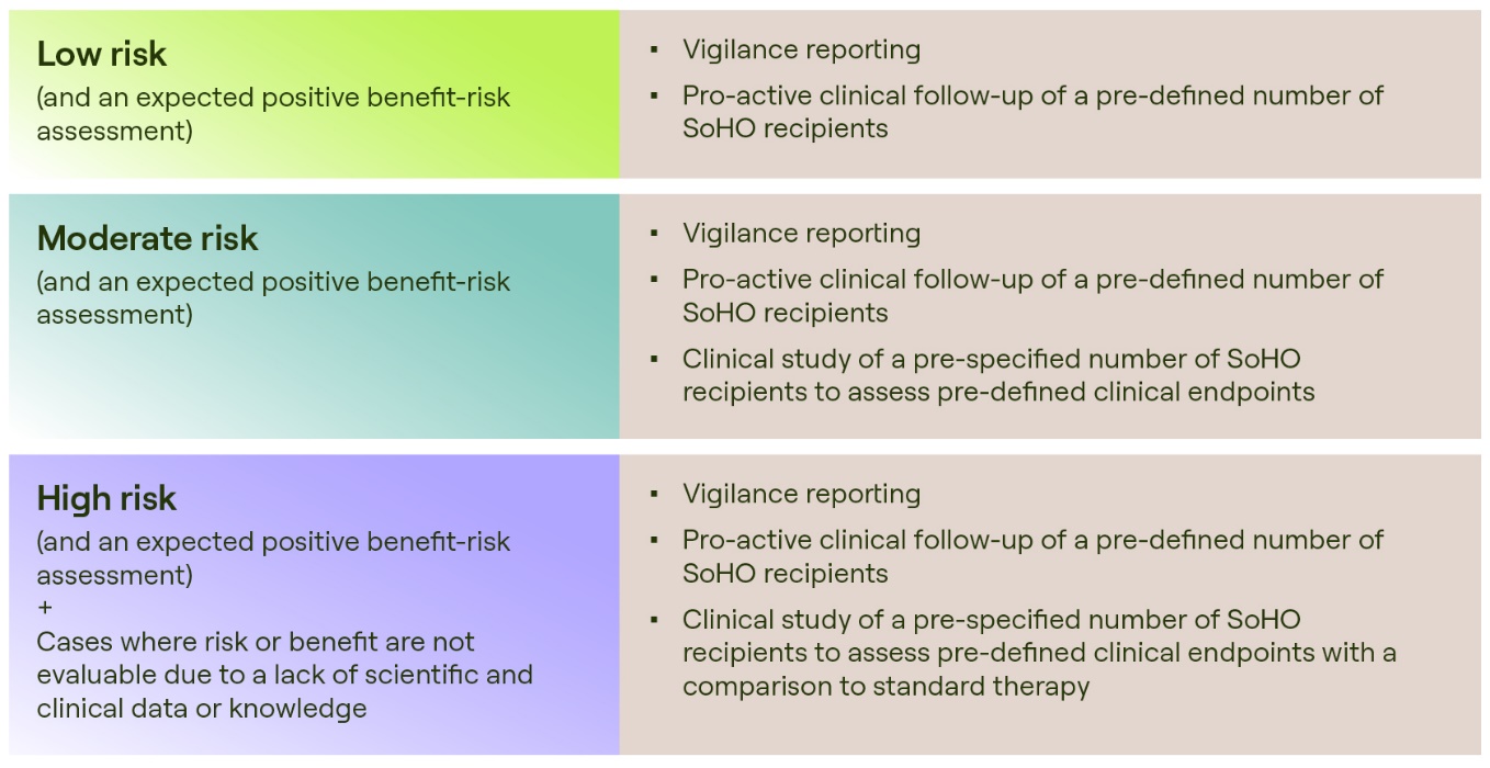 One of the objectives of the SoHO Regulation is to facilitate the development of innovative BTC therapies. For this purpose, a risk-based authorization model was introduced, requiring developers to provide sufficient clinical evidence to demonstrate the safety and efficacy of SoHO preparations in a manner that is proportional to their level of innovation and risk.
