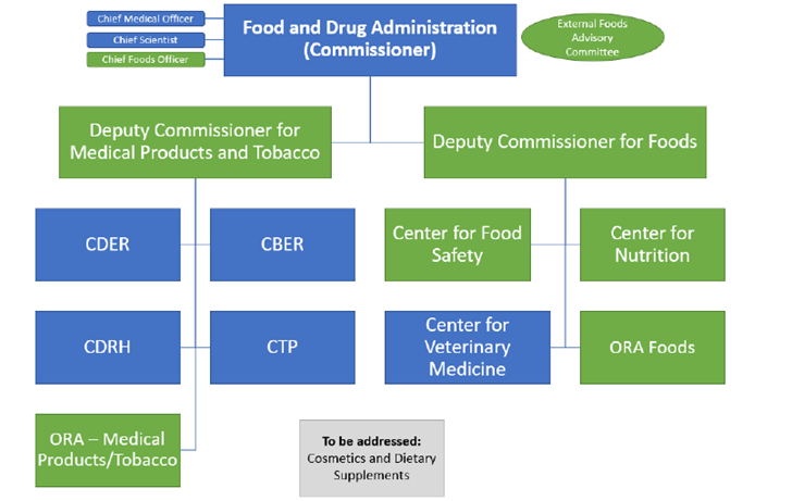 - Option B – Separate medical products and foods programs within FDA. This option would create two new Deputy Commissioner roles within FDA; one for Foods and one for Medical products and Tobacco. It would also establish a Chief Foods Officer within the Office of the Commissioner similar to the existing role of Chief Medical Officer. According to the Panel, the presence of two deputies would, “indicate the equal importance of the foods and medical products mandates” and increase the visibility of the Human Foods Program.