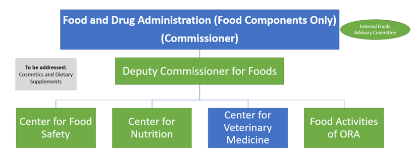 - Option C – Establish CFSAN as overall lead for the FDA Human Foods Program. This option would consolidate the Program under the Director of CFSAN with the Center for Veterinary Medicine (CVM) Director as the deputy for the program.4 However, the CVM Director would still report on non-food-related activities directly to the FDA Commissioner. It would also establish a Chief Foods Officer in the Office of the Commissioner who would, “coordinate response to outbreaks and cross-Agency food issues, medical foods, biotech, etc. and serve as the lead for cross-Government food-related activities.”