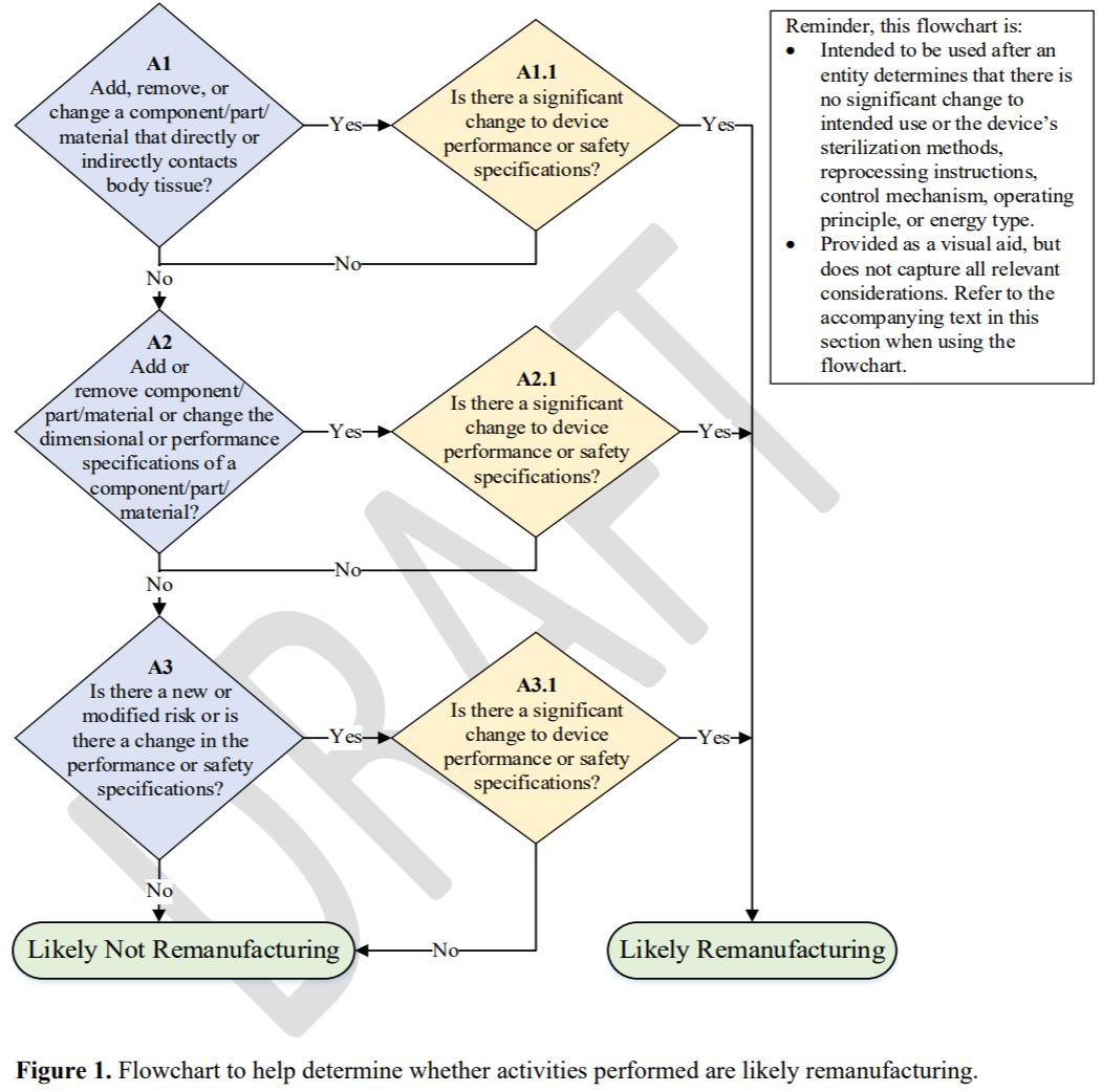 As noted in Figure 1, the flow chart is only intended to be used after a determination is made that there is no significant change to the device’s intended use or to its sterilization methods, reprocessing instructions, controls mechanism, operating principle, or energy type; any of which would indicate the occurrence of a remanufacturing activity. If that determination is made, the flowchart may then be helpful in determining if the activity is still likely to be considered “remanufacturing.”.