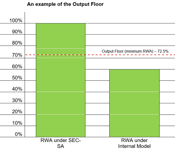 For illustration, in the below table a bank calculated its RWA under the SEC-SA approach to be 100%. It then subsequently ran the Internal Model (for example, the SEC-IRBA), and calculated a more accurate RWA of 60% (due to a number of variables in the transaction which the SEC-SA did not take into account). However, as a result of the operation of the output floor, the bank would have to use an RWA minimum of 72.5%, thereby losing the benefit of the additional 12.5% (i.e. 72.5% - 60%) it was able to obtain under SEC-IRBA.