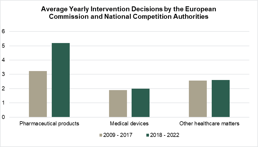 In the five-year period from 2018 to 2022, the European Commission and national EU Member State competition authorities were involved in 26 cases in relation to pharmaceutical products that either ended in a finding of an infringement or the acceptance of binding commitments (i.e., “intervention” decisions).1 A further 10 intervention decisions were adopted in cases concerning medical devices, and 13 in cases relating to other healthcare matters.