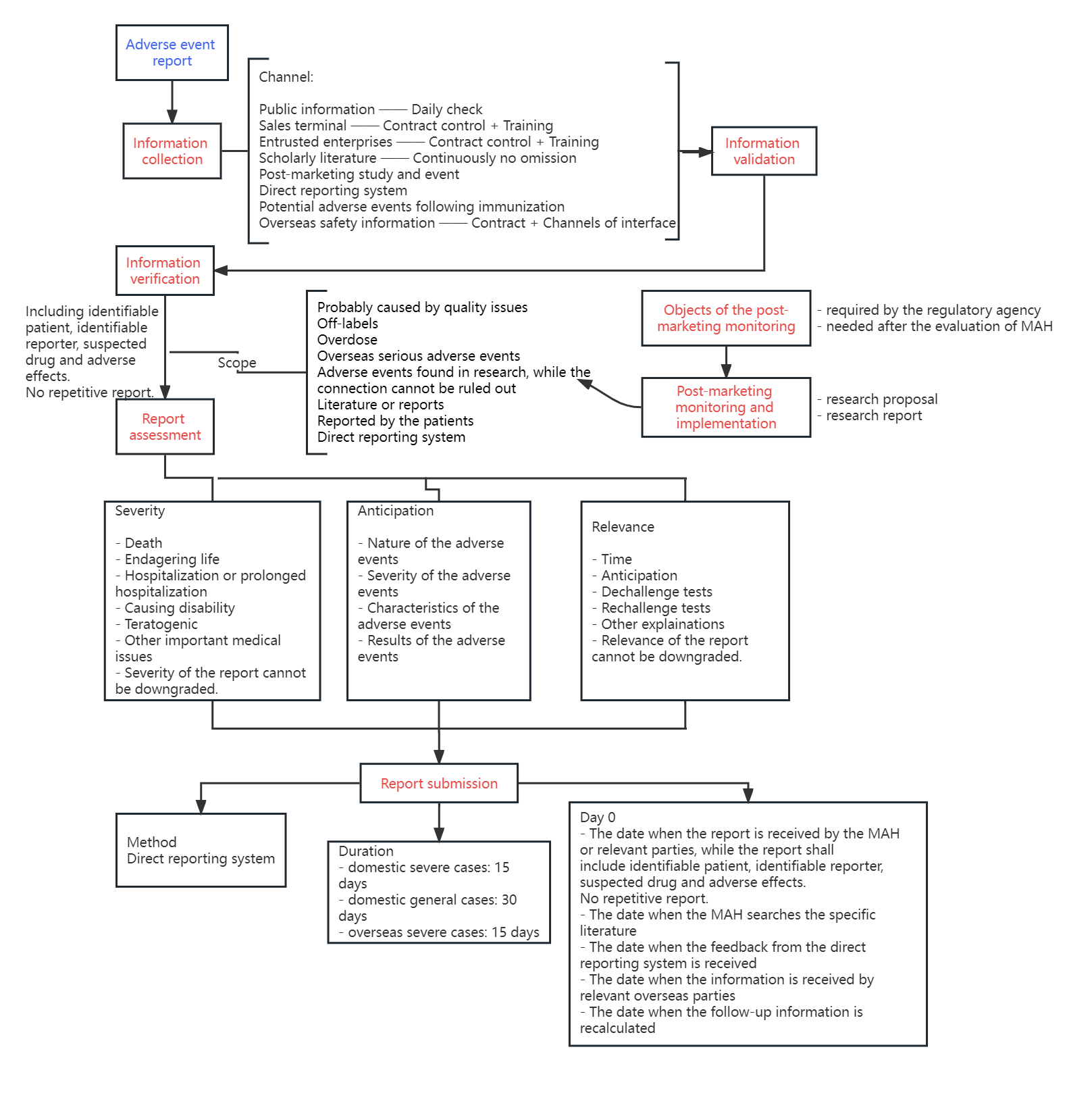 Monitoring and reporting adverse effects has been attached with great importance, as shown in the China GVP, which requires MAHs to proactively and effectively collect any information of potential adverse effects in full edges, including adverse effects taking place overseas. Once such information is noticed, MAHs shall collect further information, and proceed with the analysis and assessment. MAHs shall then report any adverse effects to the NMPA via an electronic system. The China GVP sets forth detailed guidelines for the whole process, which is visualized in the flow chart below by the Jiangsu GVP Guidelines: